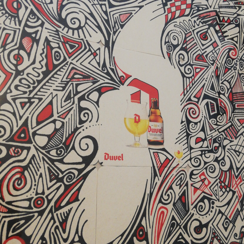 De bierkaartjes werden nadien op doek verwerkt, wat zorgt voor een uniek en gelaagd effect. Daarnaast werk ik ook op papier, waarbij de tekeningen zorgvuldig worden ingekaderd.