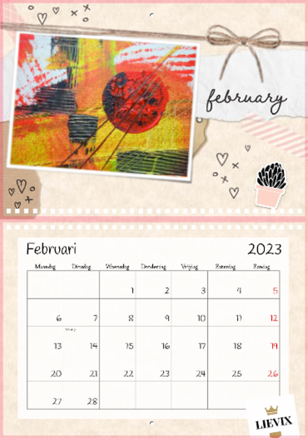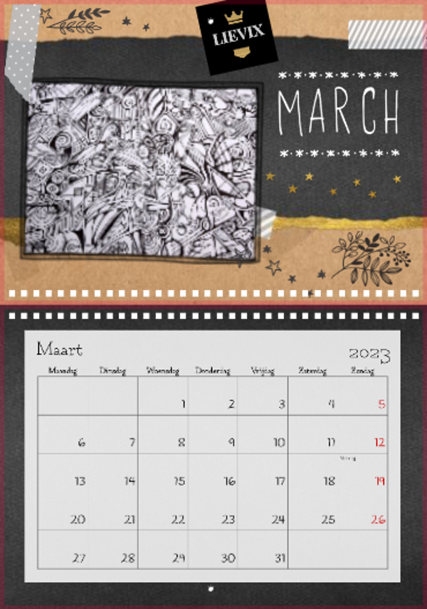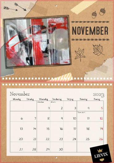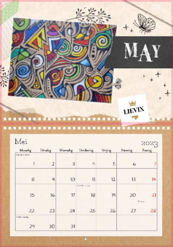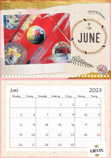 Zorg 12 maanden lang voor een glimlach met de Lievix wandkalender 2023.A4 – met binding aan de bovenkantFormaat indien opgehangen: 29,7 x 21 cm